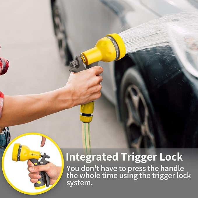 • LABOR-SAVING DESIGN: AUTOMAN garden nozzle features a nice lock bar at the top of the handle that keeps the water remains on without you having to apply any pressure.Just use the lock so you don't have to keep your hand holding it the whole time.