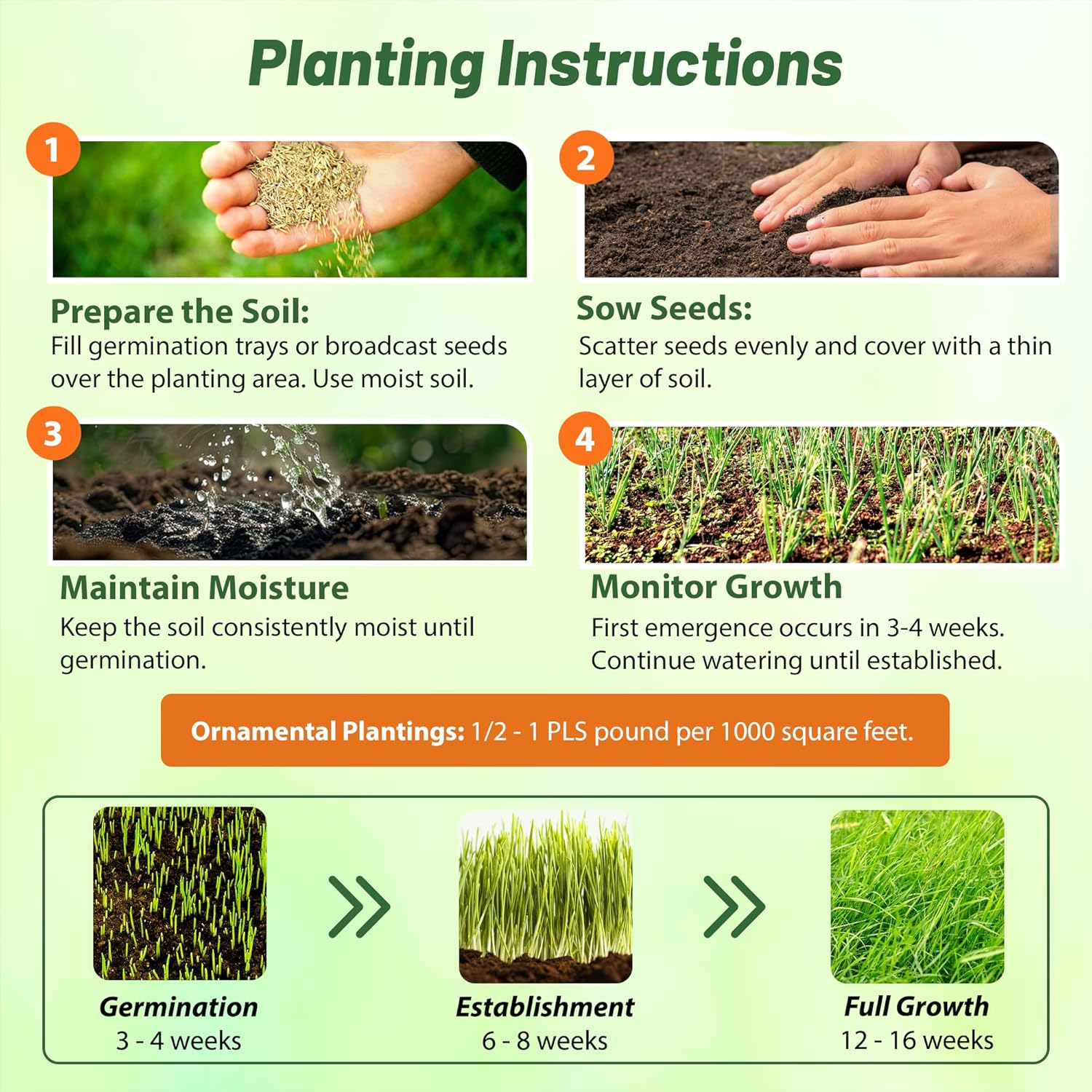 • EASY SOWING AND GROWTH: Sow each heirloom Big Bluestem warm season grass seed in germination trays or directly broadcast over your desired area. For best results, keep the soil moist until germination. Recommended seeding rate for gardening with prairie plants is 1 to 1.5 pound per 1,000 square feet.