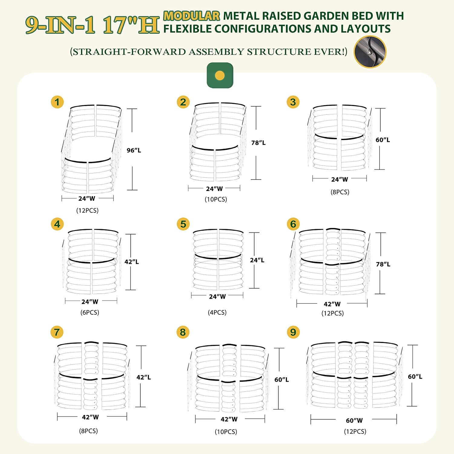 • 9-in-1 CUSTOMIZE YOUR GARDEN-The galvanized garden planter box with 4 corner panels and 8 side panels for 9-in-1 modular kit, meaning you can modularize metal raised garden bed with flexible configurations and layouts. Owning this outdoor galvanized raised garden bed for vegetables, you can create a variety of options that perfectly fit your diverse planting ideas. This raised garden bed kit in grey color would be a great addition for your patio, porch, deck and garden.