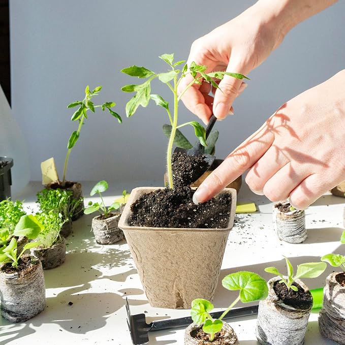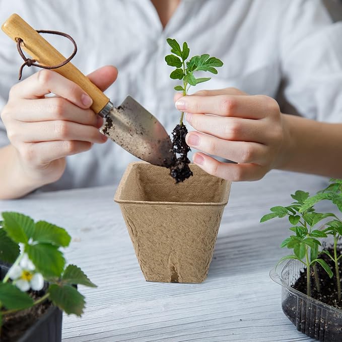 • Square peat pots: the square peat pot plant starters are about 2.3 x 2.3 x 2.2 inches, which is suitable for vegetable, flower, and melon seedlings cultivation; and the plant label size is about 2 x 0.4 inches, suitable for your use