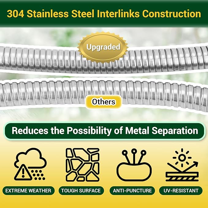 - Interlinking Technology of Stainless Steel Hose, No Kink but Roll up Easy: 360Gadget heavy duty garden hose is designed with spiral interlink technology that prevents kinking and bending, ensuring a constant flow of water that saves you both time and energy. Unlike traditional hoses, our metal water hose is easy to coil into a perfect circle for convenient storage. No more struggling to roll up a kinked hose or untangling it every time you need to use it.