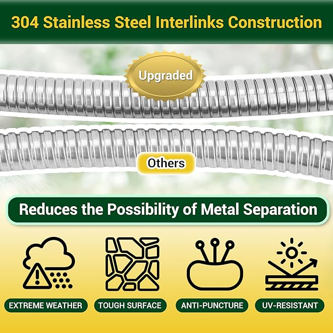 - Interlinking Technology of Stainless Steel Hose, No Kink but Roll up Easy: 360Gadget heavy duty garden hose is designed with spiral interlink technology that prevents kinking and bending, ensuring a constant flow of water that saves you both time and energy. Unlike traditional hoses, our metal water hose is easy to coil into a perfect circle for convenient storage. No more struggling to roll up a kinked hose or untangling it every time you need to use it.
