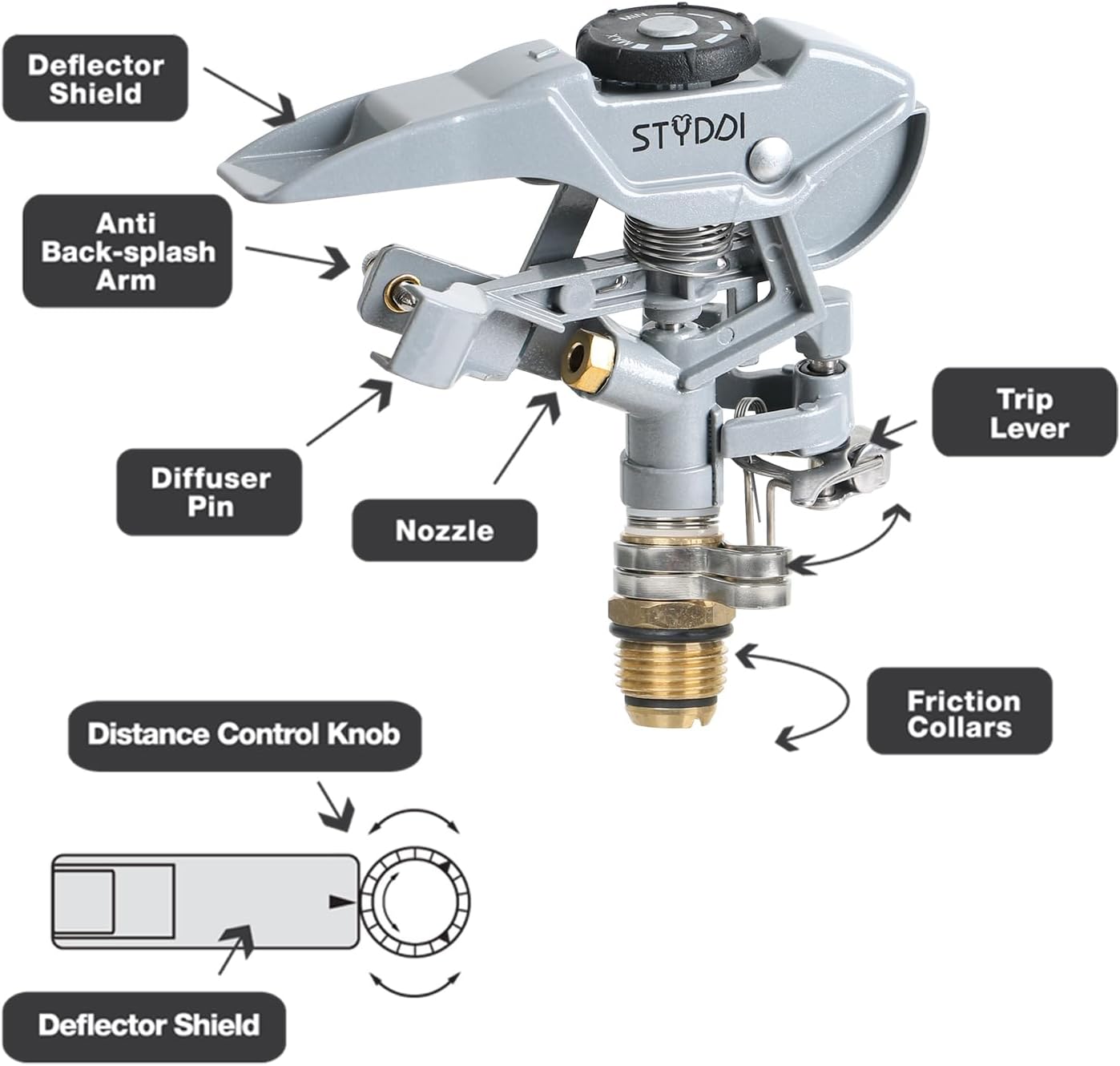 STYDDI Metal Impact Sprinkler Head, Zinc-Alloy Pulsating Water Sprinkler Head with 1/2" NPT Thread, Metal Adjustable Circle Pattern Impulse Sprinkler Head for Lawn, Yard, Garden, 20' - 43' Spray Radiu