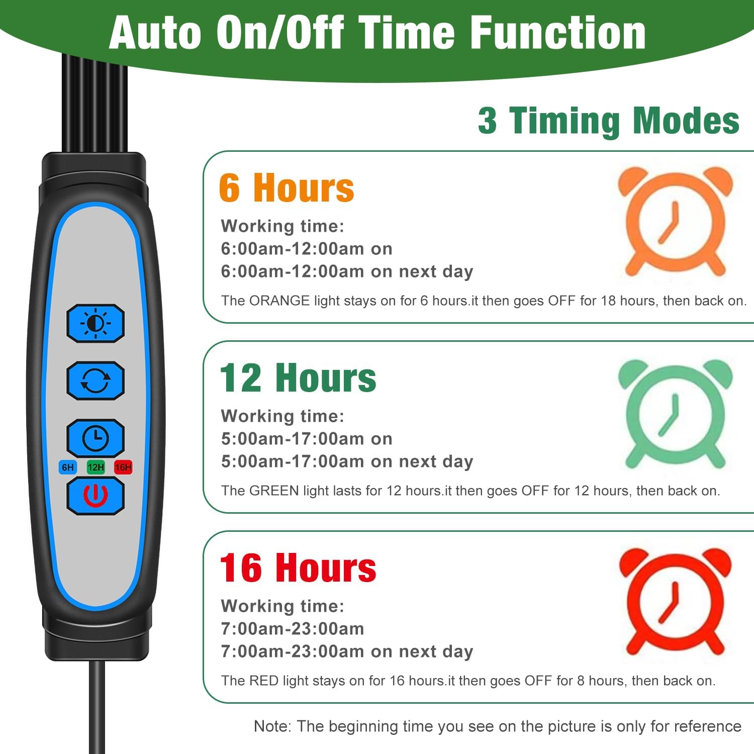 • [Upgraded Timer 6 12 16H] This grow light has a new upgraded timer, we can set the time to 6 12 16H. Through research, most plant lights on the market do not exceed 12 hours, 16H is more suitable for your plant growth. According to your setting, it will turn on and off automatically every day