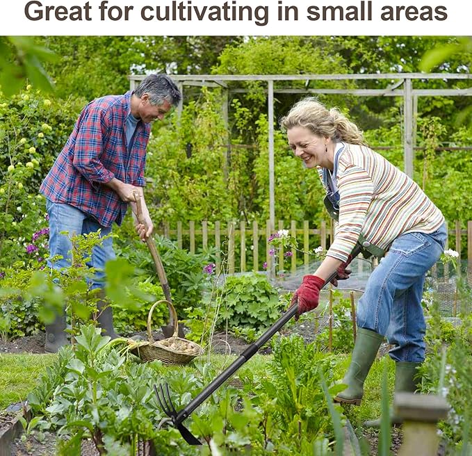 • 2-in-1 Combo Garden Hoe: Double-sided means simply flip of the handle without switching tools. The garden hoe blade for digging out dirt or chopping up weed root, and tiller end with the 3 steel prongs for stirring up the dirt and weeding in small flower bed or garden. (NOT FOR HARD SOIL)