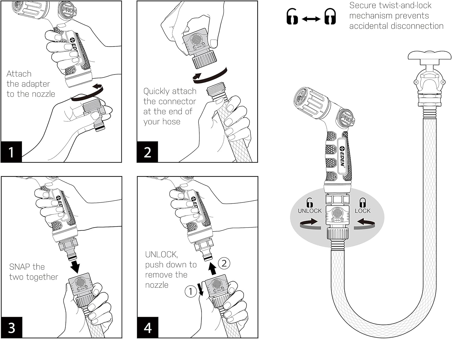 Eden 94827 Heavy Duty Metal Garden Hose Thumb-Control 4-Pattern Nozzle W/Quick Connector Set, High Pressure Garden Sprayer for Watering Gardens, Lawns, Plants