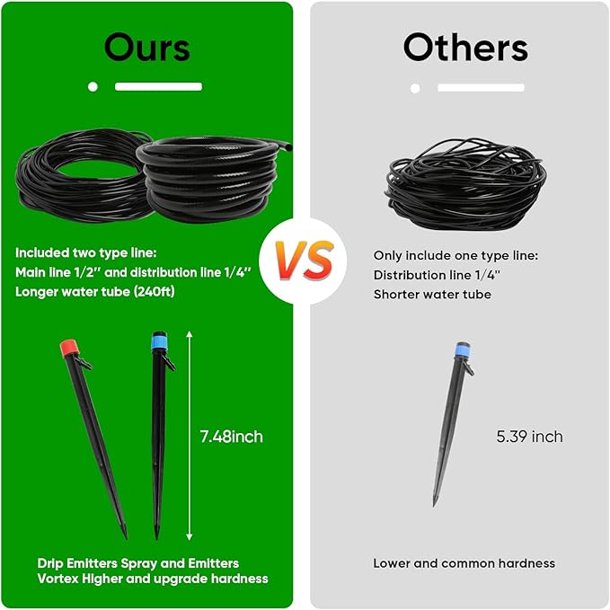 • 240FT Drip Irrigation Kit: The irrigation kits include 40FT main tubing (1/2"),200FT distribution tubing (1/4"), it comes with totally 136 parts and we offer enough accessories for you to build up 2 sets small drip irrigation systems or 1 set longer irrigation system.