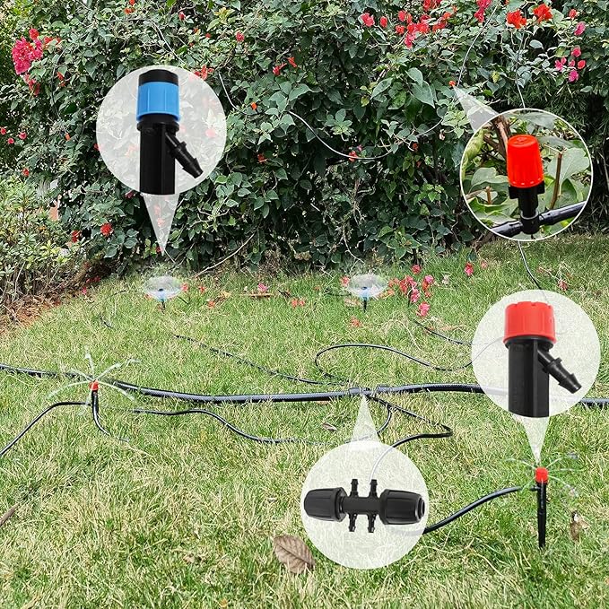 • 3 Kinds of Sprayers: We include 3 kinds of sprayers to adjust different water flow you need. We includes 10 pcs drip emitter stream, 10 pcs drip emitter vortex, 20 pcs misting nozzle.