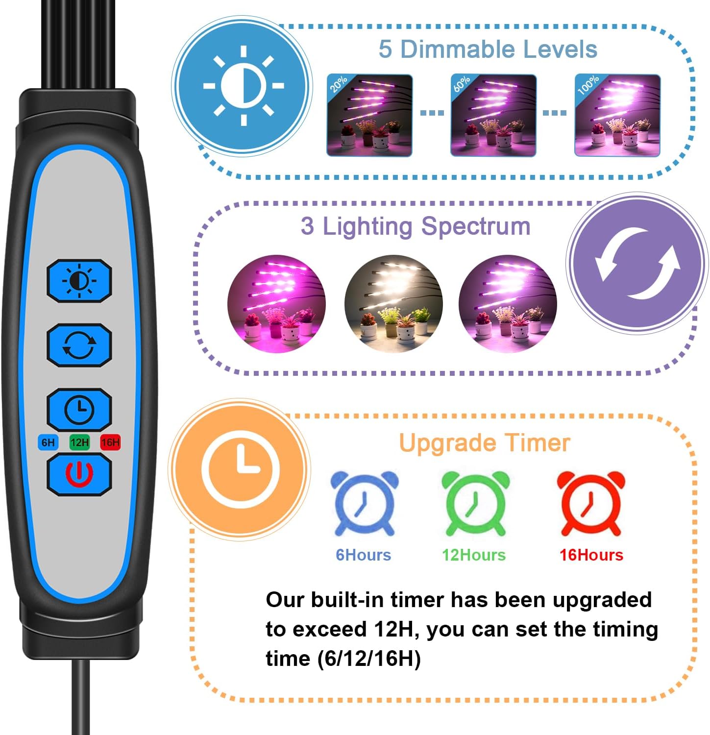 • [Upgraded Timer 6 12 16H] This grow light has a new upgraded timer, we can set the time to 6 12 16H. Through research, most plant lights on the market do not exceed 12 hours, 16H is more suitable for your plant growth. According to your setting, it will turn on and off automatically every day