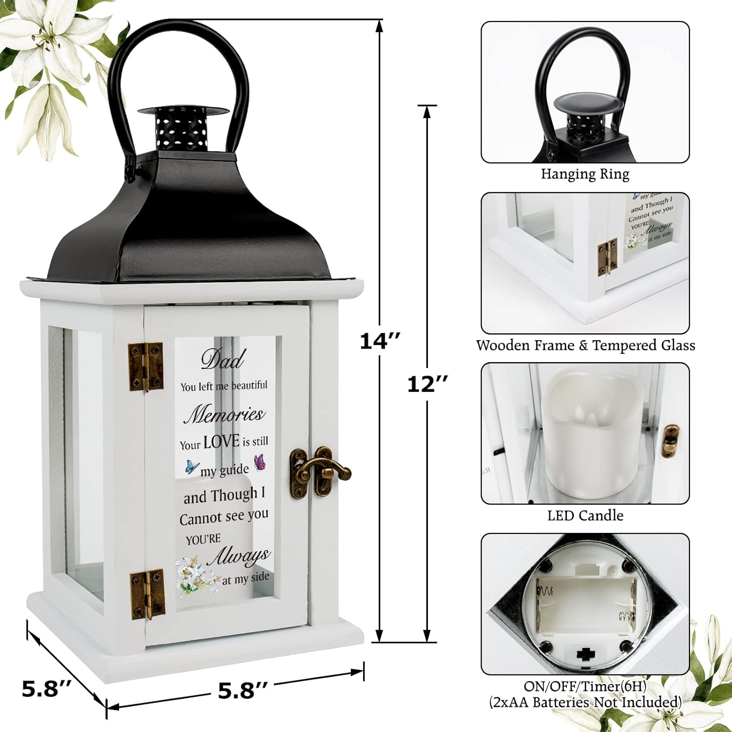• Sympathy Gifts for Loss of Dad: Memorial lanterns are custom memorial gifts for loss father that offer hope, comfort and help to a grieving friend or family member. Flickering flameless candle lights surround us like those we love never leave. Longer lasting than other gifts like flowers, place sympathy lanterns around home to remind you of happy memories. Father's love is eternal and will always be by your side.