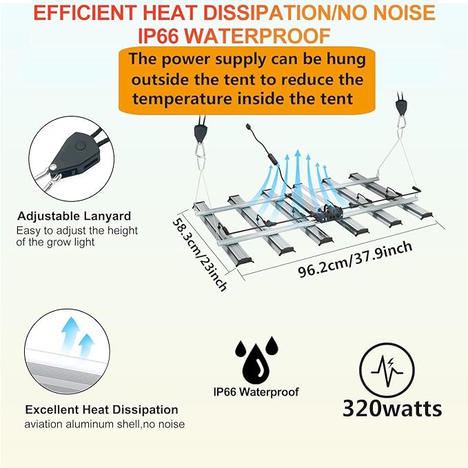 • 【Efficient Heat Dissipation and No Noise】Our grow lights are made of 4 lightweight aluminum bars, which has efficient heat dissipation and cooling functions.it's powerful heat dissipation ability that no need to buy more cooling devices.This led plant light has no fan, there will be no noise.it is very light weight and IP67 waterproof,so it's easy to carry and install.