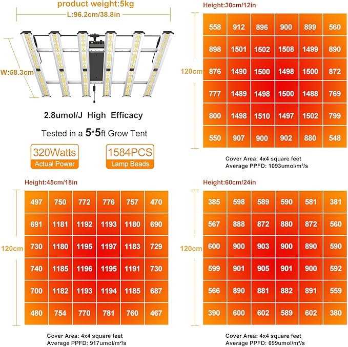 • 【Max Coverage Area Plant Lamp Full Spectrum】320W Full spectrum (380-410 nm, 660-665nm, 730nm,3200-4200K,4800-5000K) is perfect for veg to grow,6 LED grow lights bars , it can provide evenly distributed light intensity.It can coverage for 4x4ft of high-yielding full-cycle growth.