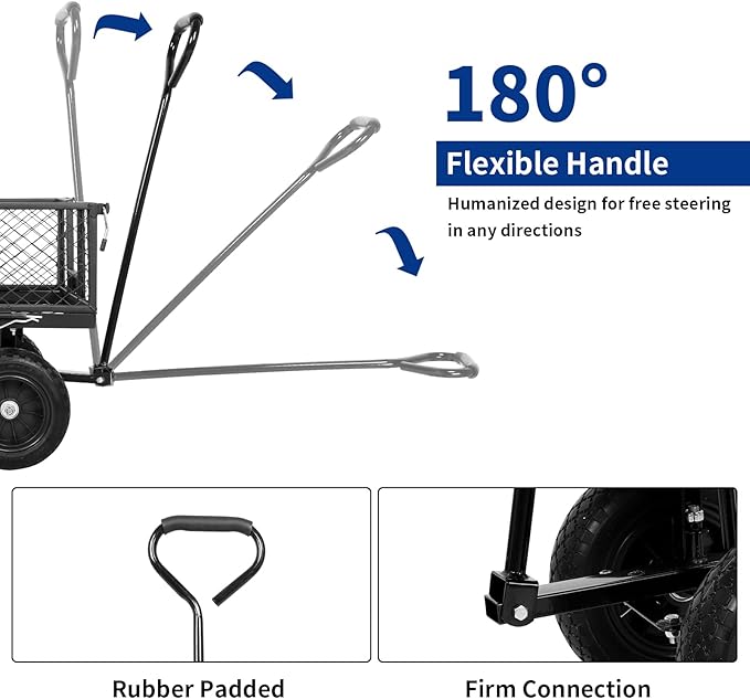 • EASY ASSEMBLY: The garden cart is designed to be easy to assemble. With simple and straightforward instructions, you can quickly put the cart together and start using it right away. The 180° rotating handle allows for easy maneuverability, while the quick-release feature makes it easy to unload and load items quickly.