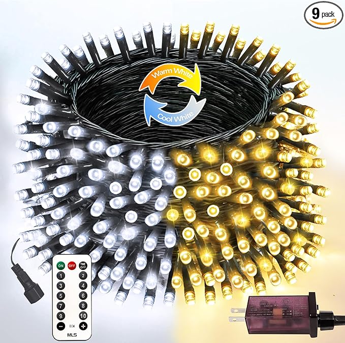 • New Upgraded Extendable Plug in String Lights for Christmas Decor: Warm white and cool white two colors in one set,super bright with new upgraded LED bulbs. This extendable 200 LED green wire plug in string lights have 9 lighting modes to satisfy your diverse decorative effect. Total length is 75.8ft, of which 66ft with lights