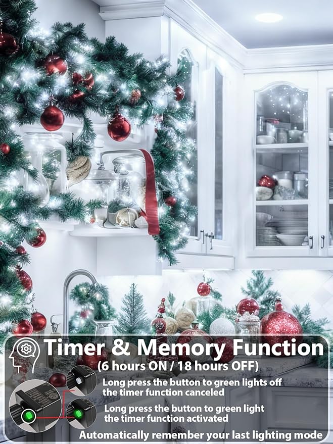 • Timer Function and Memory Funtion: With built-in timer IC, long press the button of the adaptor to green, the timer function acitivated and it will be on for 6 hours and off for 18 hours repeatedly everday. The Xmas lights also have memory function, will remember your last lighting mode, free your hands from pressing the button everyday.