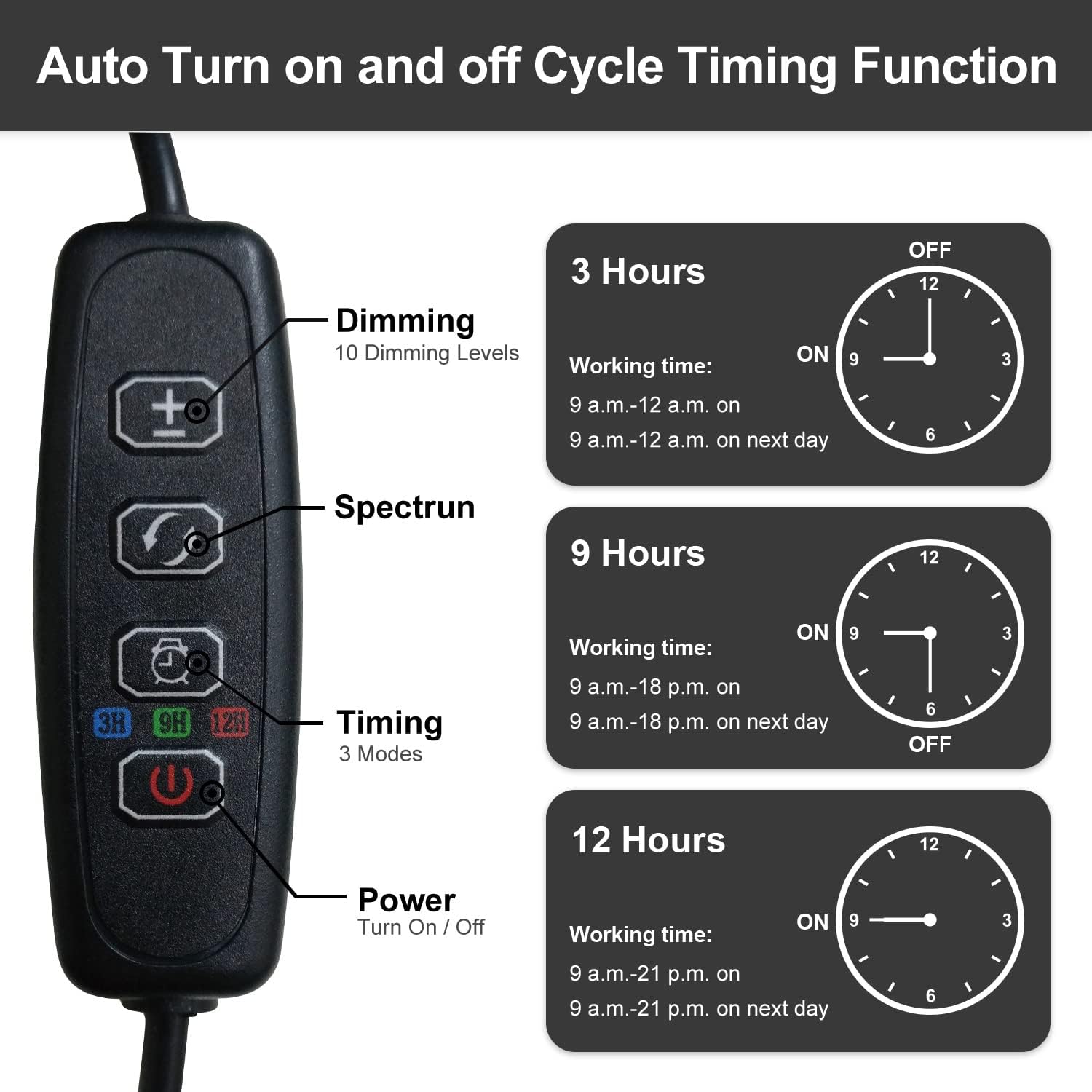 • Cycle Memory Timer: Set it once, the grow light will automatically turn off for 3/9/12 hours at the same time every day.