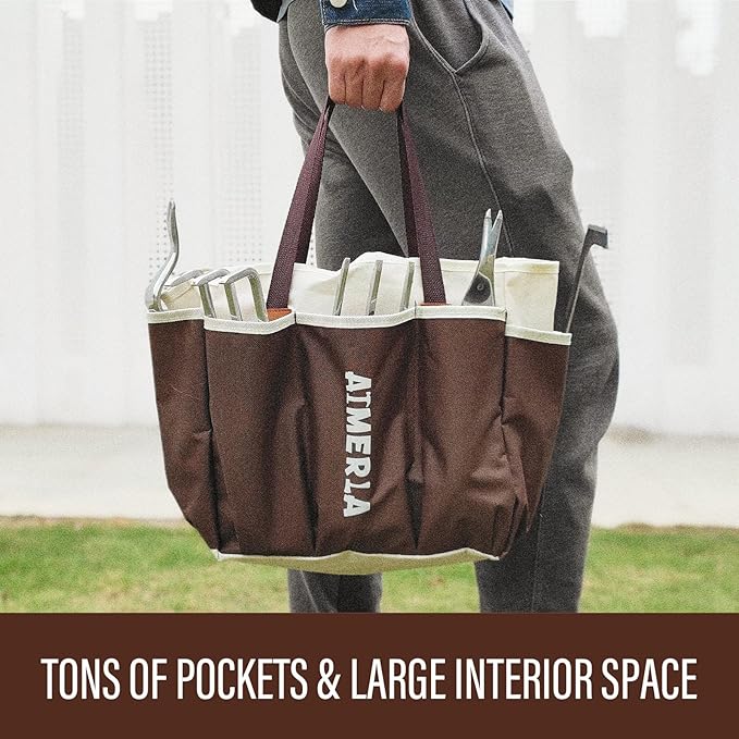 • TONS OF POCKETS & LARGE INTERIOR SPACE BAG !Our tool hand bag boasts 8 exterior pockets versatile storage of tools, shears, screwdrivers and accessories. It will keep your gear organized and secure, no more digging through the bag to find that one tool. The bag is designed with large interior space which affords you retrieval of any tool.Improved and upgraded deep pocket design ensures that your tools won't slip out of the pocket.