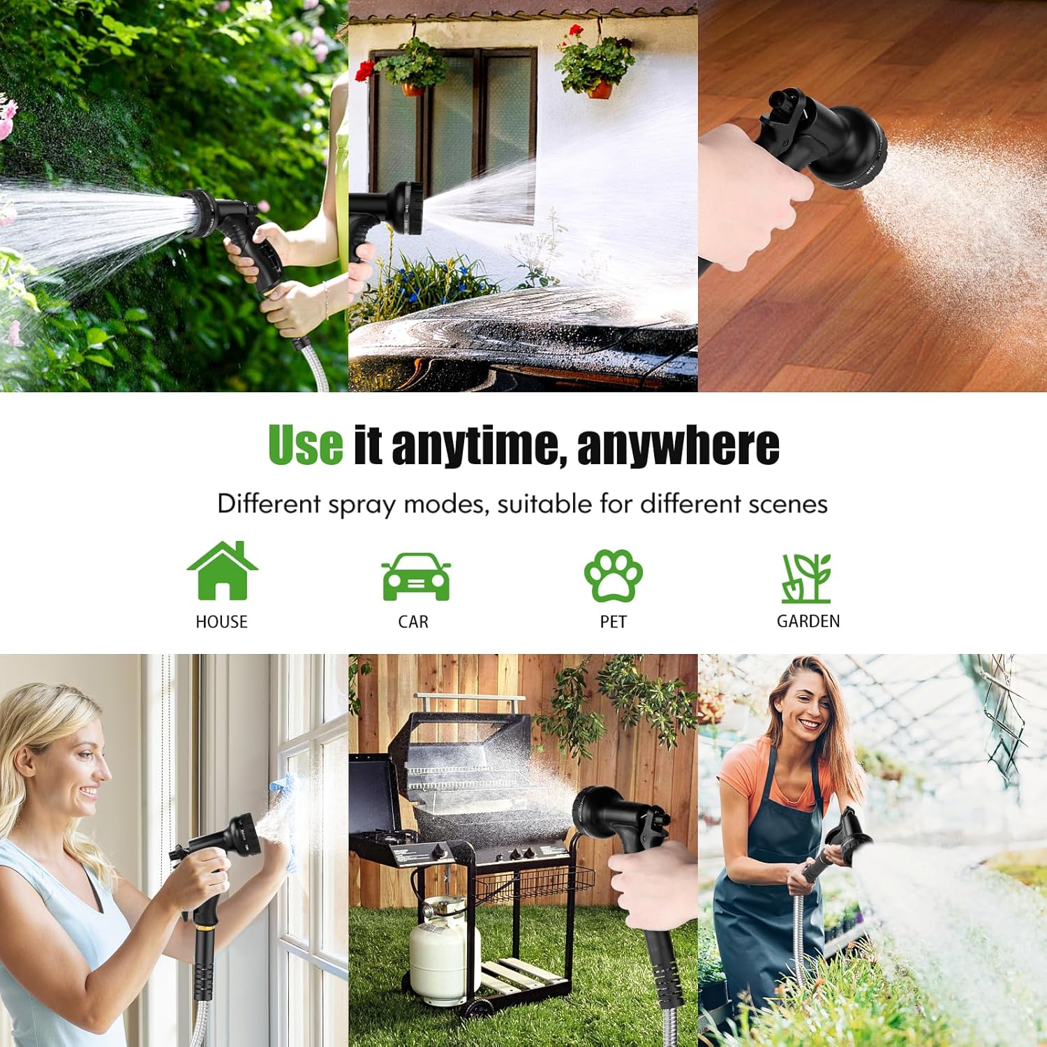 - Each outdoor garden hose has connectors on both sides. When the garden hose does not reach the length you need, you can connect two different hoses to extend the total length. The metal is extremely lightweight and highly flexible,maximizing your storage space and ensuring that it can be neatly organized and stored. It can simply be hung on an outdoor faucet or fence, or placed in storage bags and boxes. Each item includes one hose,one 10-function hose nozzle, and three replaceable rubber rings.