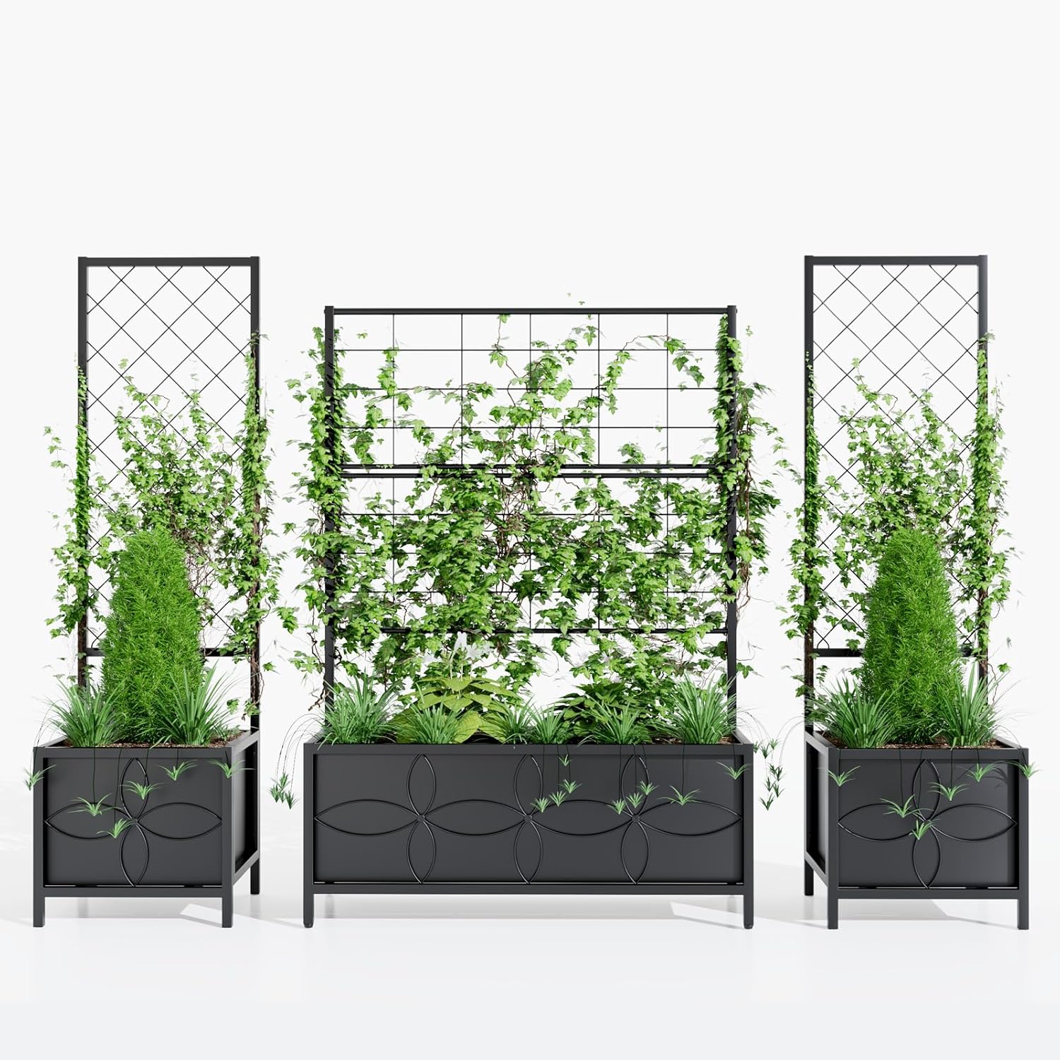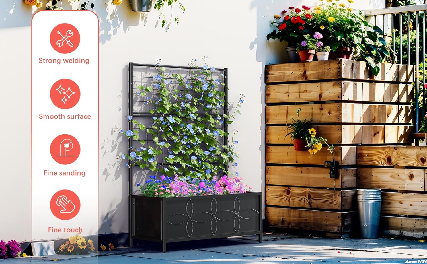 • This planter with trellis is made of a strong carbon steel base. It's sturdy and solid for long time and durable usage. Moisture Resistant,Maintain beauty and performance.