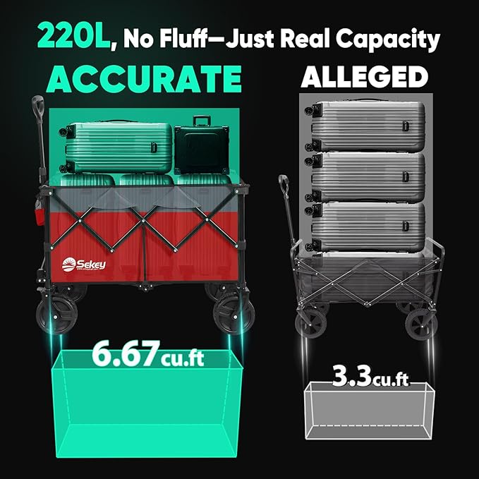 Sekey 220L Collapsible Foldable Wagon with 330lbs Weight Capacity, Heavy Duty Folding Utility Garden Cart with Big All-Terrain Beach Wheels & Drink Holders.Red&Grey
