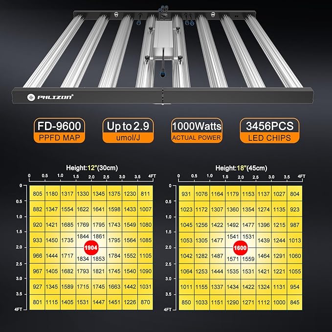 • USED WITH LEDS MAXIMIZE YIELD - The FD9600 series grow light use with LM281B led Chips 3456pcs high efficient SMD leds,boast the market-leading efficiency to 2.9 µmol/J and 2.5g yield per wattage with 30% higher Average PPFD, the actual power is 1000 watt.