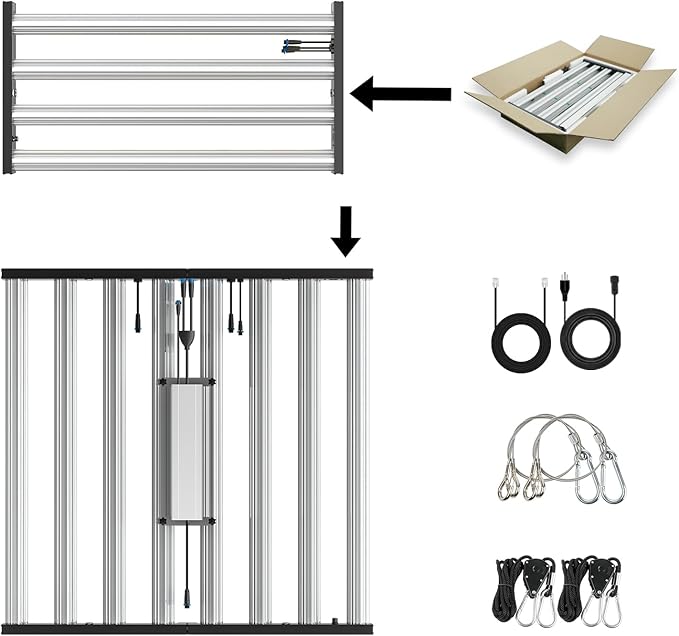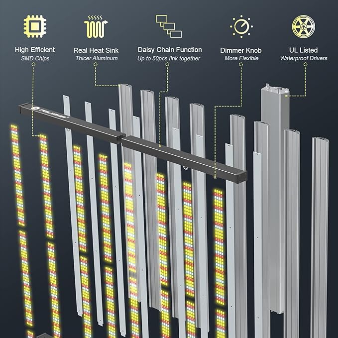 • NO NEED CONTROLLER DAISY CHAIN- Innovative easy daisy chain dimming function, no need to buy controllers, just use the daisy chain to link all the lights, then dimmable one light , all lights follow. Up to 50pcs lights can be connected together. Unfold to use, no installation need. 1PCS Perfect for 4x4ft 5x5ft 6x6ft 7x7ft coverage,up to 7.2*7.6ft growing area in Veg stage and 7*7ft for flower stage.