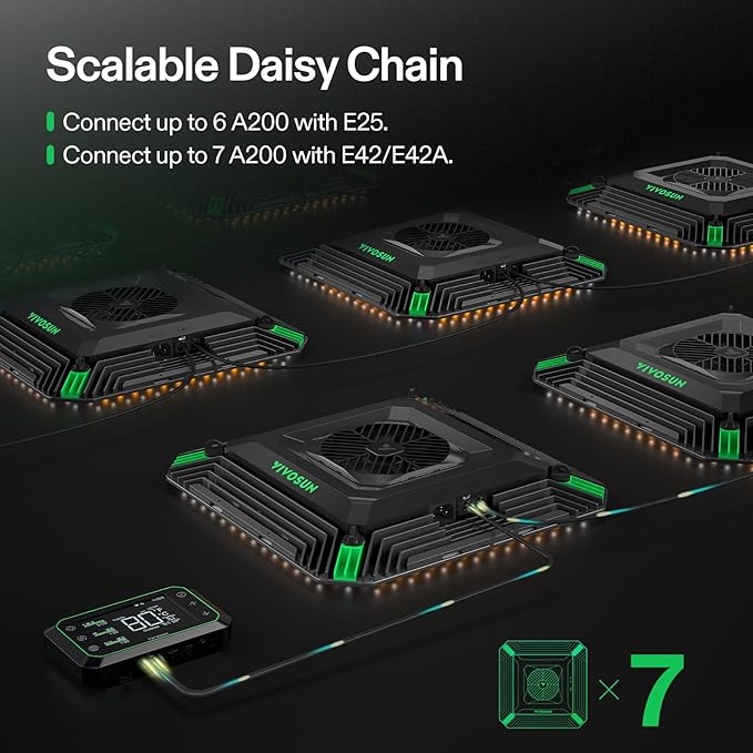 • Integrated Circulation Fan: The centrally located circulation fan in the LED balances airflow where other fans cannot reach, allowing more air to enter the canopy directly and balancing temp and humidity; To unlock additional features, the fan must be used with the Vivosun Growhub Controller (E42A/E25), available for separate purchase