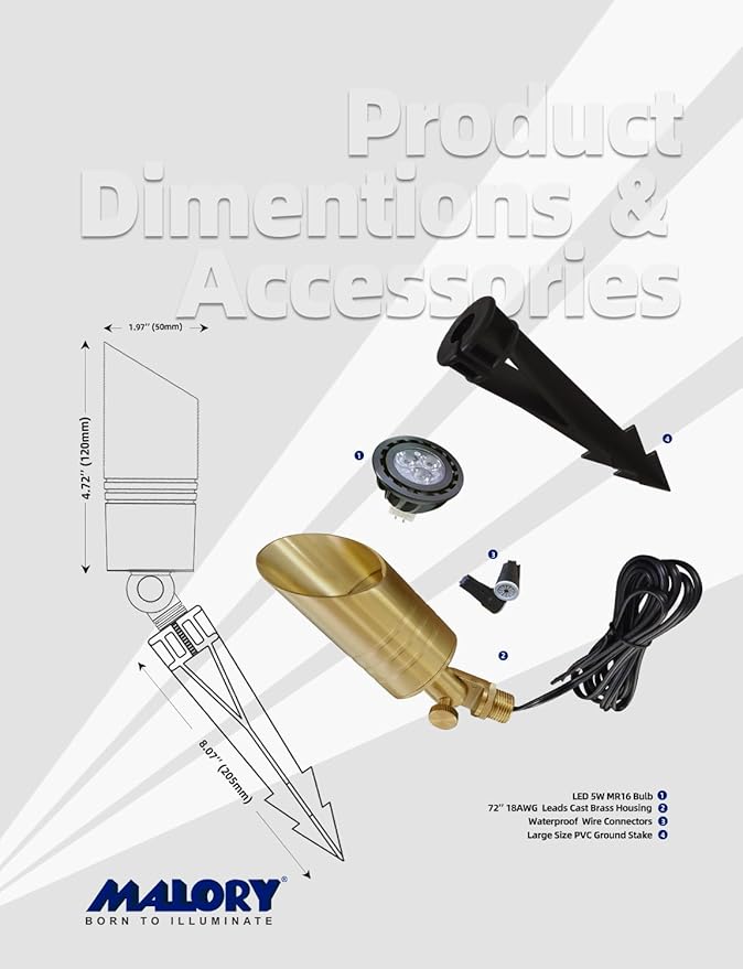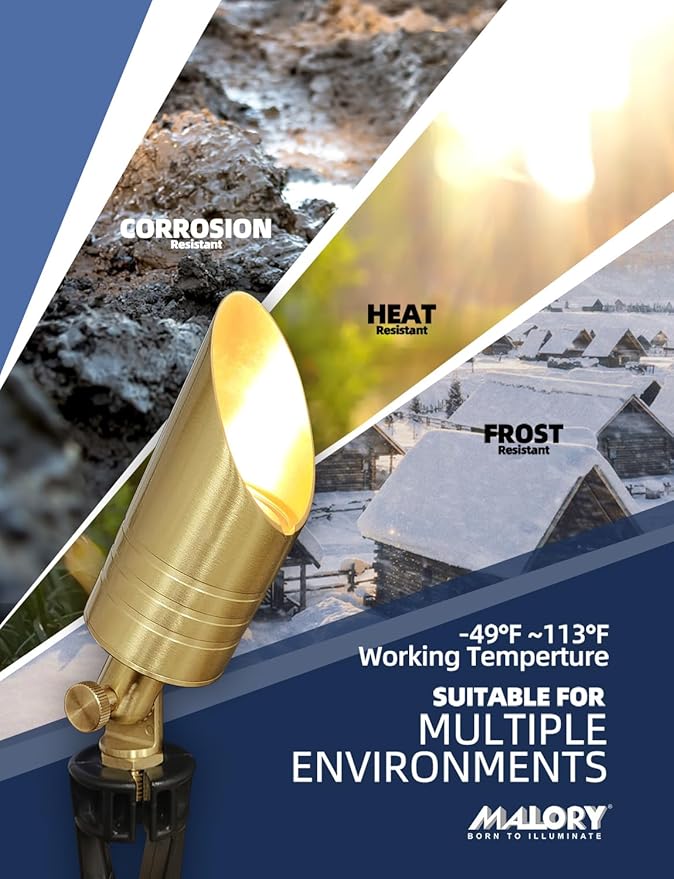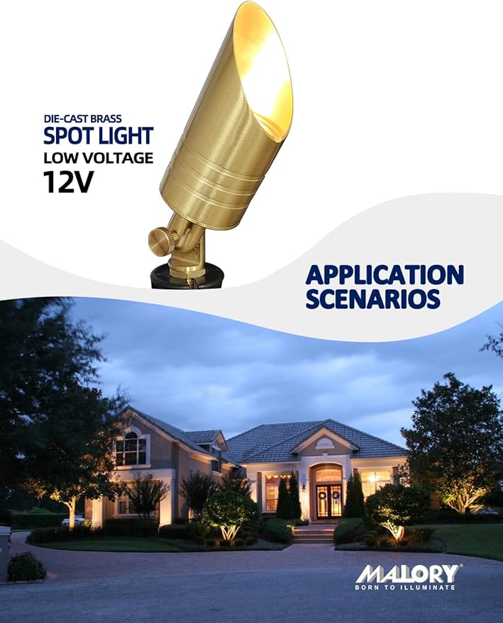 • BRASS LIGHT FIXTURE:MALORY landscape spotlight is constructed of die-cast brass for durability and beauty.Brass spot light doesn't corrode,more durable and reliable than aluminum and plastic fixtures,ideal for any uplighting application.Simple design structure for the light fixture make it looks beautiful yet unobtrusive in any landscape,suitable for decorating most houses and yards.