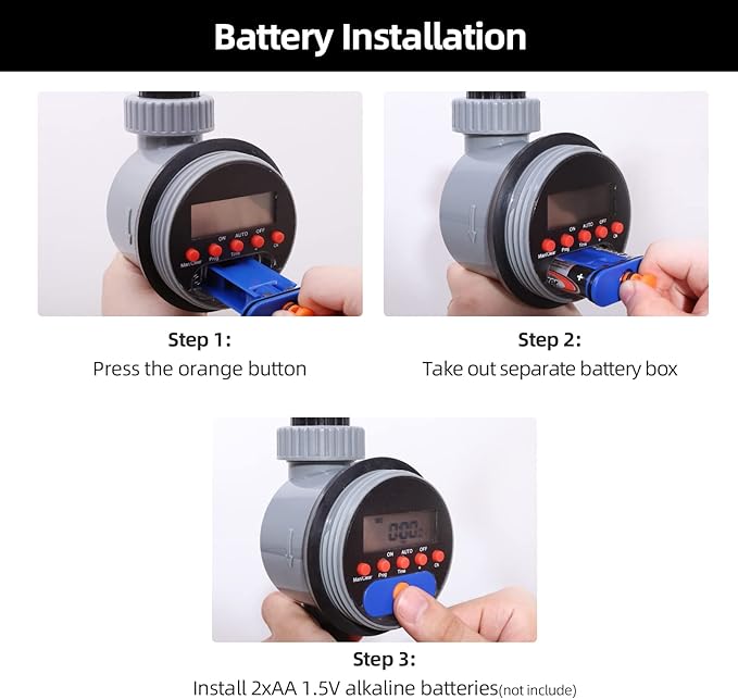 • Compared with traditional ball valve timers, this product has upgraded ball valve functions (better leakproof design), delay function (maximum water conservation) and battery function (larger capacity battery room design: only 2*1.5V AA can use alkaline battery - not included).