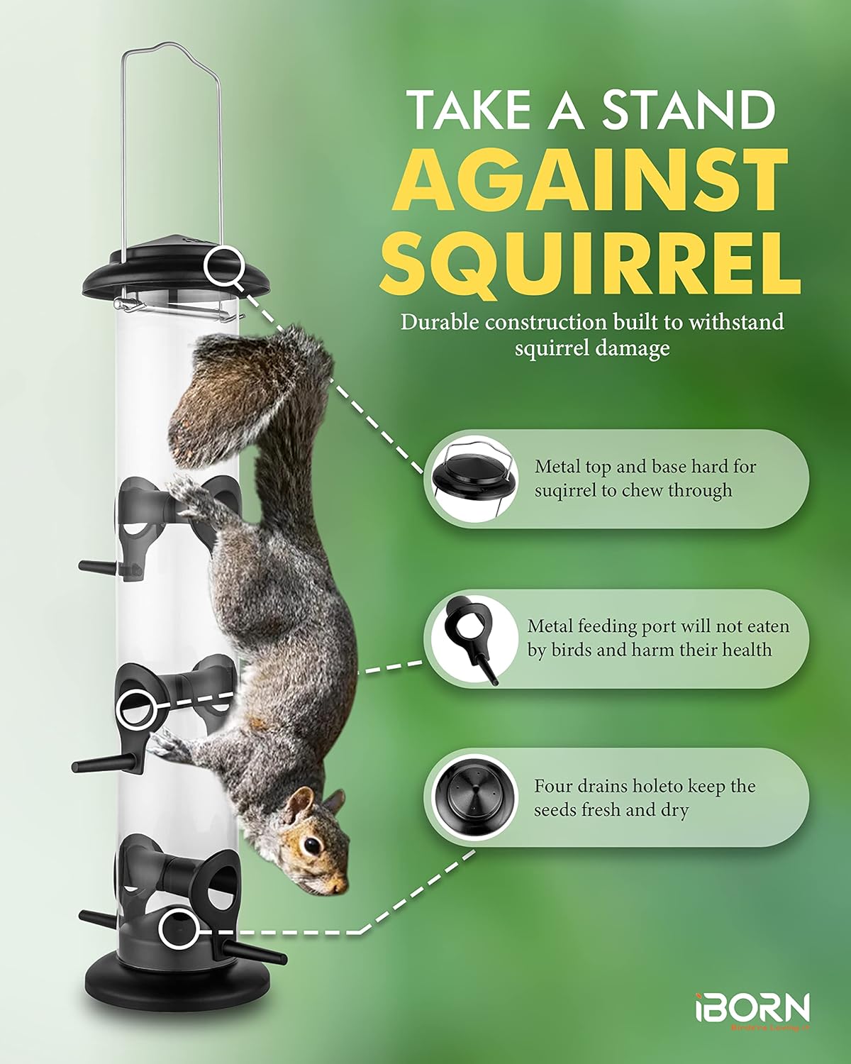 • 【Metal Bird Feeder】Metal top & base, aluminium feeding ports survived from Squirrel Damaging. Durable quality to sustain wear and worn outdoors. We adopt advanced technique for metal finishing to help the metal last longer when used outdoors.