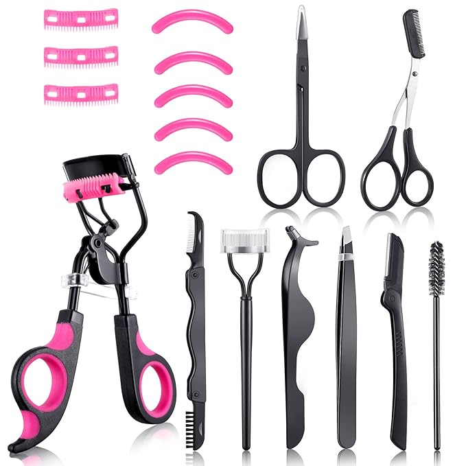 • Nice Eyelash Curler Combination Set: the eyelash curlers kit includes 1 lash curler, 1 pair of scissors, 1 pair of scissors with comb, 1 pair of eyelash extension tweezers, 1 false eyelashes applicator, 1 retractable eyebrow trimmer, 1 eyebrow brush, 1 eyebrow trimmer, 1 foldable steel comb, 5 silicone refills pads and 3 brush refills, the nice combination can meet your daily needs