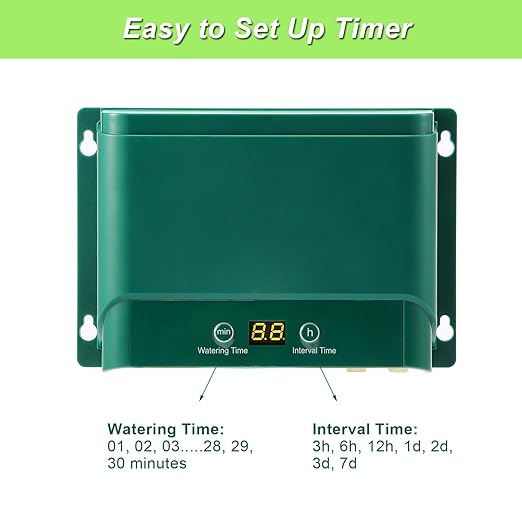 • 【Programmable Timer】--- Unit was easy to program. Just set the watering time (hit set) and the interval time (hit set) and away you go. The timer can be set at hour or day intervals. The automated watering schedule offers 30 modes of operation, with 1,2,3…29 30 minute waterings, every 3,6,12 hours or 1,2,3 7 days