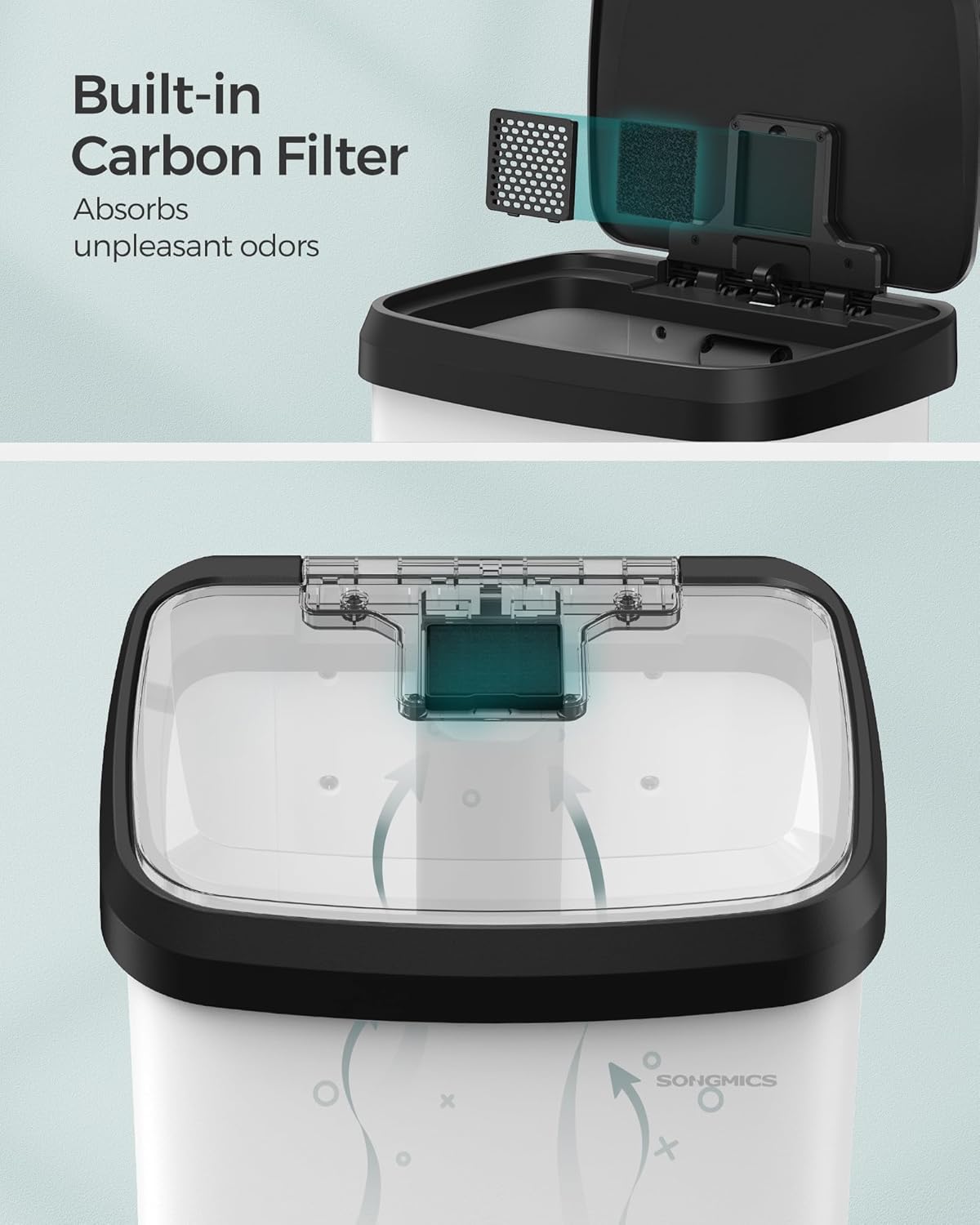 • [Thoughtful Detailing] The carbon filter in the lid helps absorb unpleasant odors, keeping your kitchen smelling fresh. Included are 15 liner bags (16-18 gallons) that perfectly fit this kitchen can
