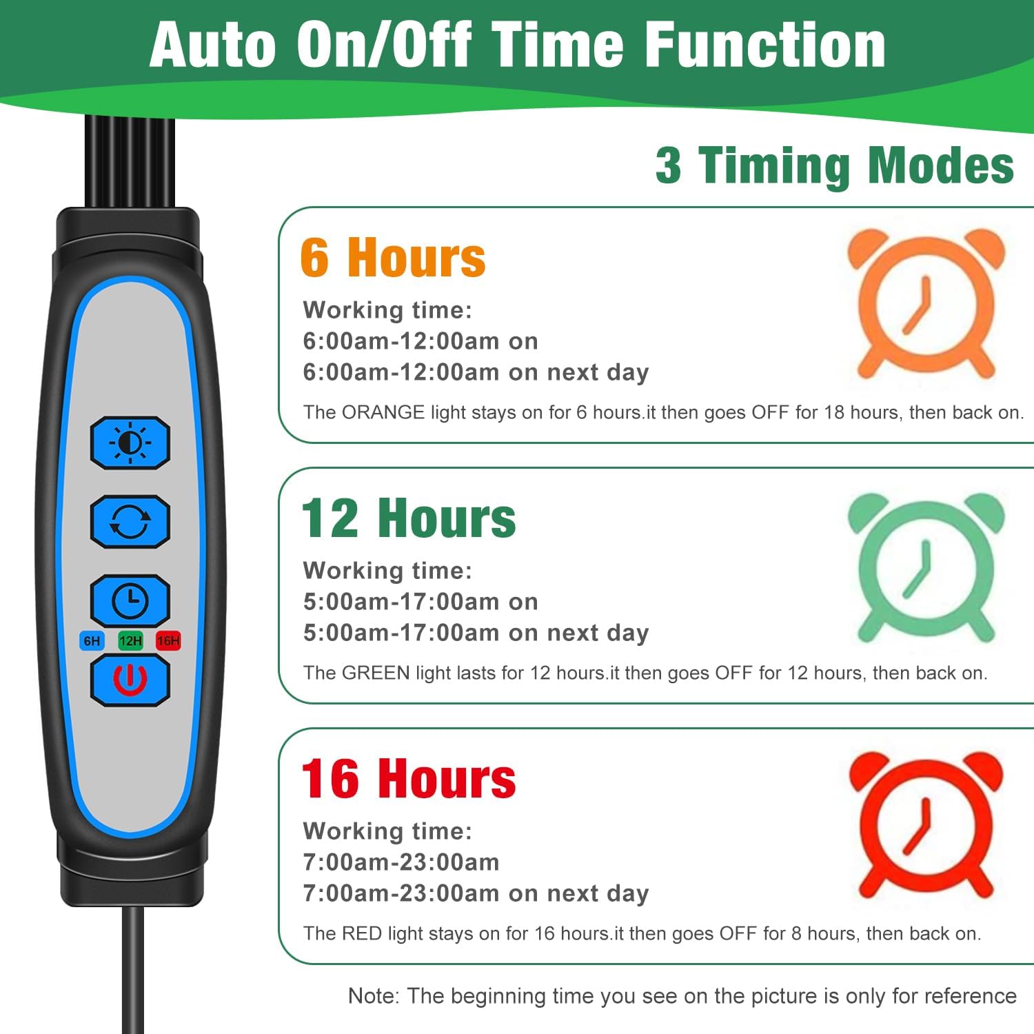 • [6 12 16H Timer] Most of the plant lights with built-in controllers on the market do not exceed the timed 12H, and ours has been upgraded to exceed 12H, which is more friendly to light-loving plants, so that the plants grow better. Set the timing time(6H 12H 16H), you don’t need to manually turn on and off the grow light. The grow light will convenient to takes good care of your plants when you go out to work or on vacation