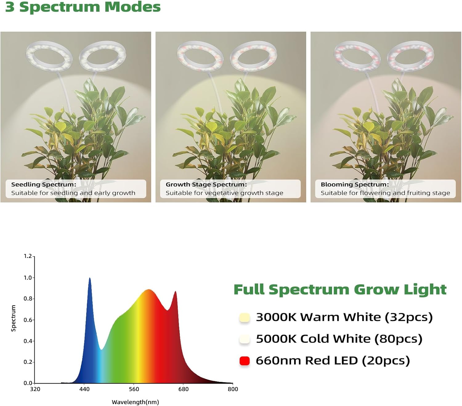 • 【3 Modes of LED Full-Spectrum Lighting】Our indoor grow light features 3 spectrum lighting modes for every growth phase: Seedling Mode(3000k White+5000k White) for roots, Blooming Mode(5000k White+red LEDs) for flowers, and Full-Cycle Mode(3000k+5000k White+red LEDs) from seed to harvest. Keeps your plants healthy in homes, offices, and dark winters.