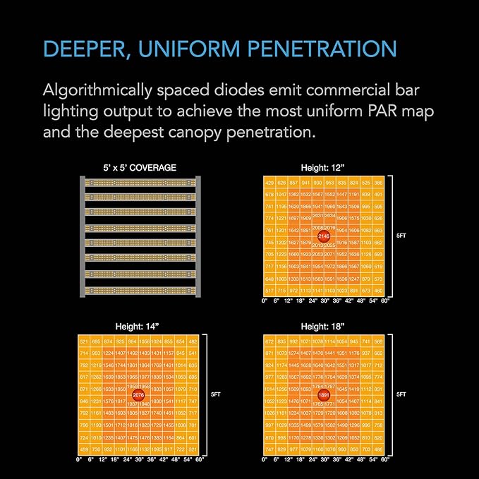 • Bar-style fixture with algorithmically spaced diodes optimized for even coverage, deep canopy penetration, and hotspot reduction.