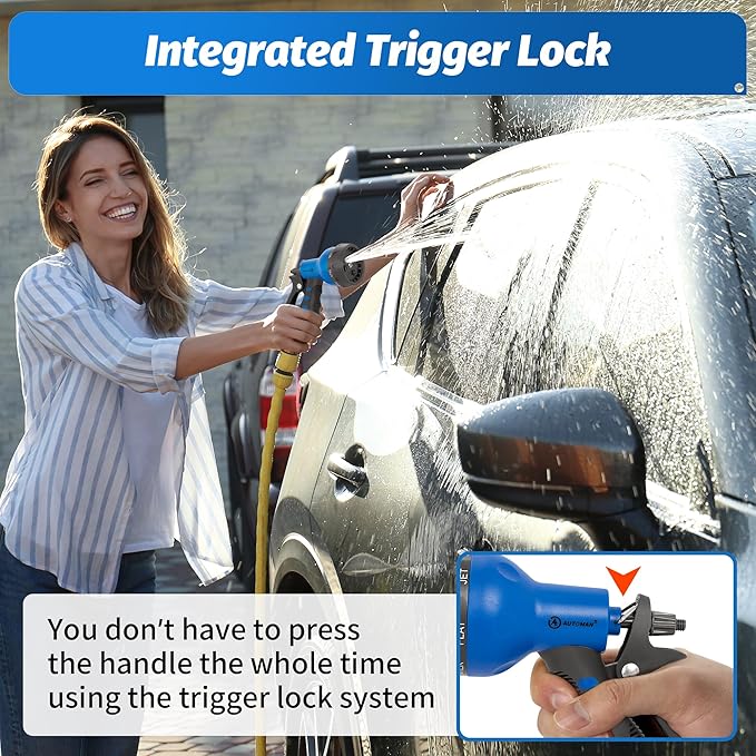 • LABOR-SAVING DESIGN: AUTOMAN garden nozzle features a nice lock bar at the top of the handle that keeps the water remains on without you having to apply any pressure.Just use the lock so you don't have to keep your hand holding it the whole time.