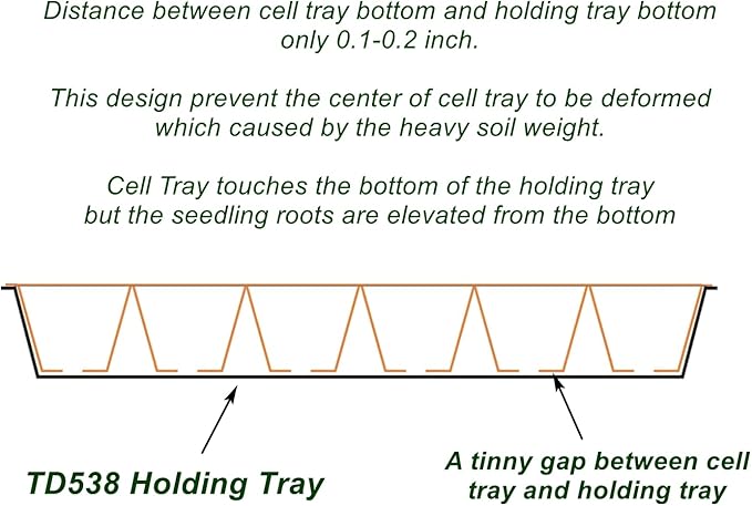 • 【Size】The top of the TD538 plant growing tray, 21 inches × 11 inches, fits perfectly with our plug trays, while the bottom, 19.1 inches × 9 inches, is also designed to fit our plug trays, ensuring that the trays won't move or shake when you move them. The tray height of 1.6 inches is designed to match the depth of the RooTrimmer 72 cell and 128 cell trays. Note: TD538 trays pfit the plug trays around 1.8 inch in height .