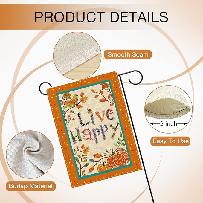 Hzppyz Live Happy Fall Garden Flag Double Sided, Inspirational Quote Autumn Pumpkin Bird Leaves Decorative Yard Outdoor Home Small Decor, Positive Farmhouse Outside House Decoration 12 x 18