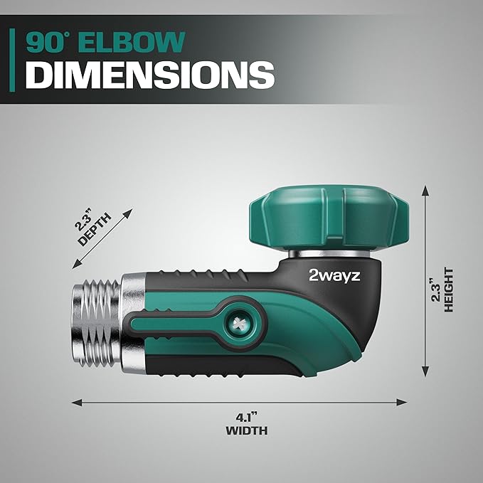 2WAYZ 90 Degree Hose Elbow Adapter - Heavy Duty Full Metal Body Garden Hose Shut Off Valve - 3/4-Inch Inlet and Outlet Angle Connector for RV, Waterhose Elbow - 2.3x2.3x4.1-Inch (Green and Black)