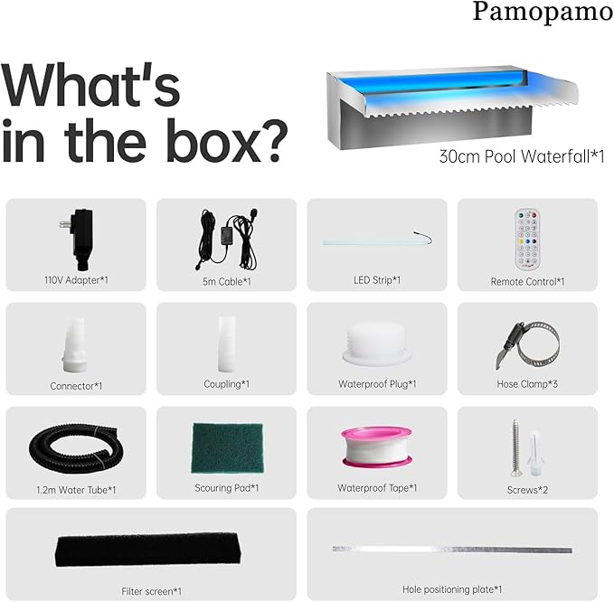 • ⏩App Control Waterproof Lights⏪ Pamopamo pool fountain is equipped with a waterproof LED light strip which can change multi colors via the RF remote or APP control. You can experience different modes through the mobile app, such as music mode, light mode, voice mode, etc.(When you can open the light strip cover, you will find that all the light beads inside have been waterproof. They can directly soak in water)