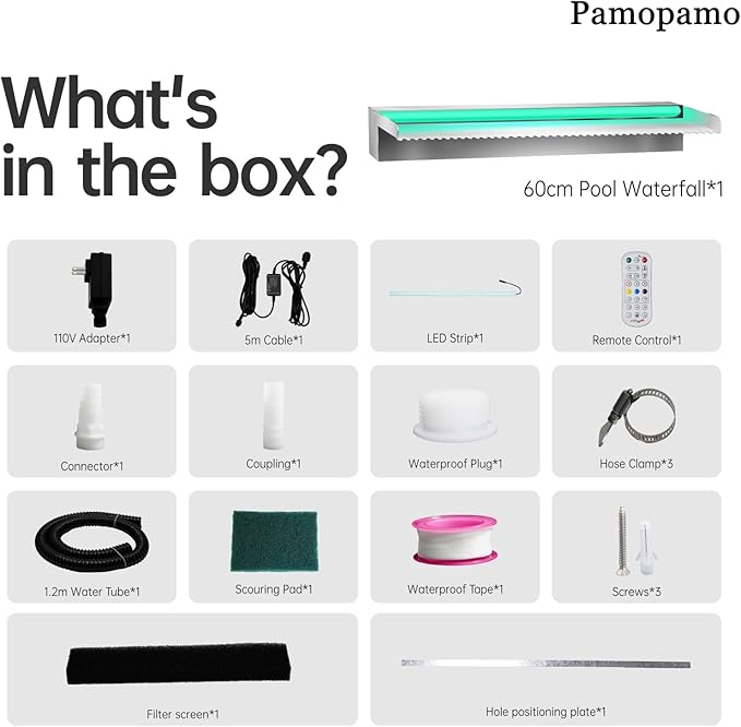 • ⏩App Control Waterproof Lights⏪ Pamopamo pool fountain is equipped with a waterproof LED light strip which can change multi colors via the RF remote or APP control. You can experience different modes through the mobile app, such as music mode, light mode, voice mode, etc.(When you can open the light strip cover, you will find that all the light beads inside have been waterproof. They can directly soak in water)