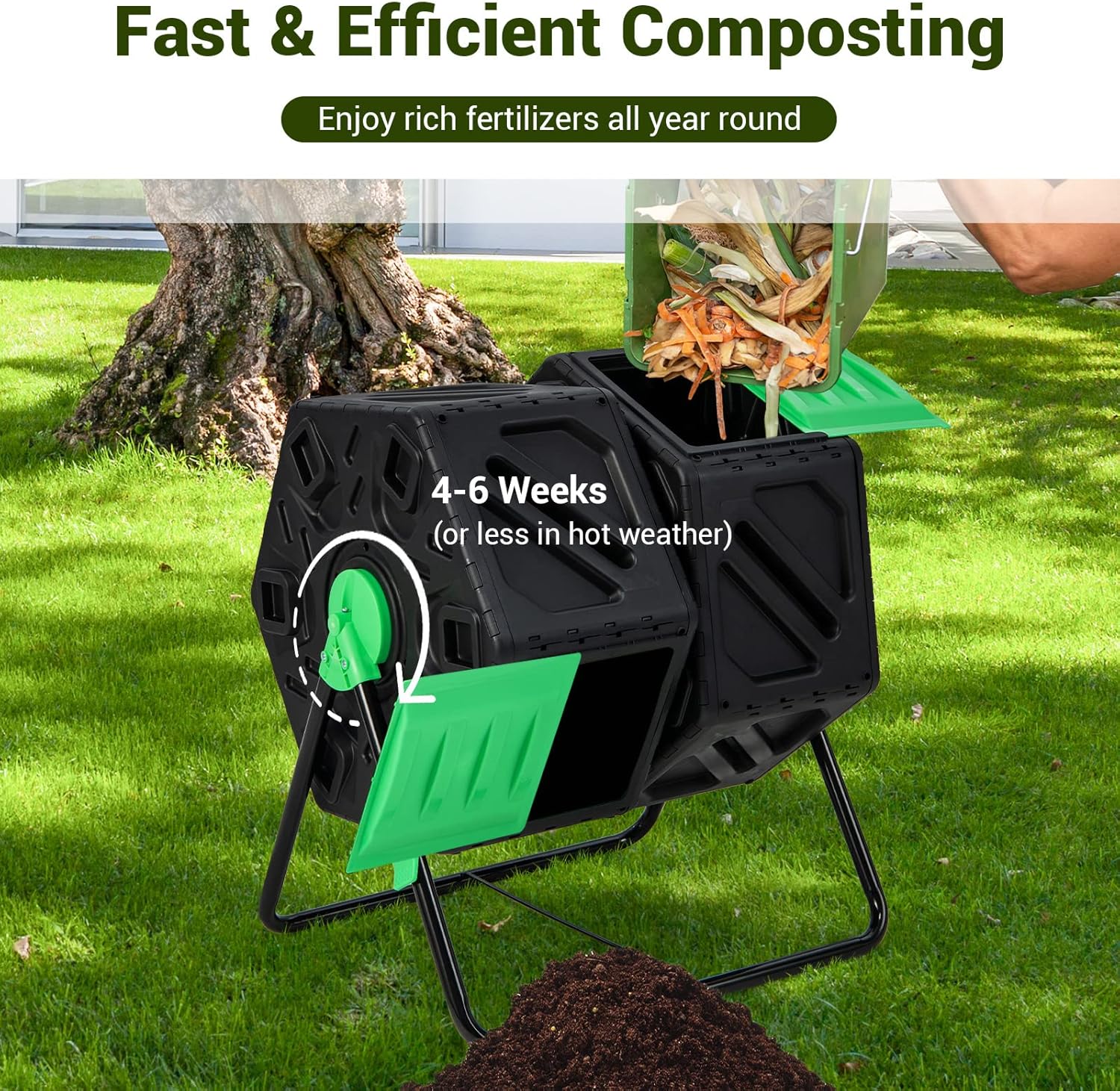• 【360° Rotatable Design】2 chambers can be separately rotated 360°, which can speed up the composting process and there is no need to dig or mix the pile by hand. And it can be easily locked by side buckles. The rotating design is also convenient to pull out fertilizer.
