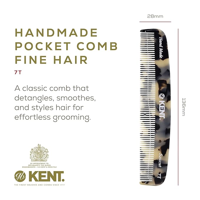 Kent 7T TW Handmade Fine Tooth Pocket Comb - For Men's Everyday Grooming, Styling, and Travel - Suitable for Mustache, Beard, Dry, Wet, Fine or Thinning Hair - Saw Cut and Hand Polished