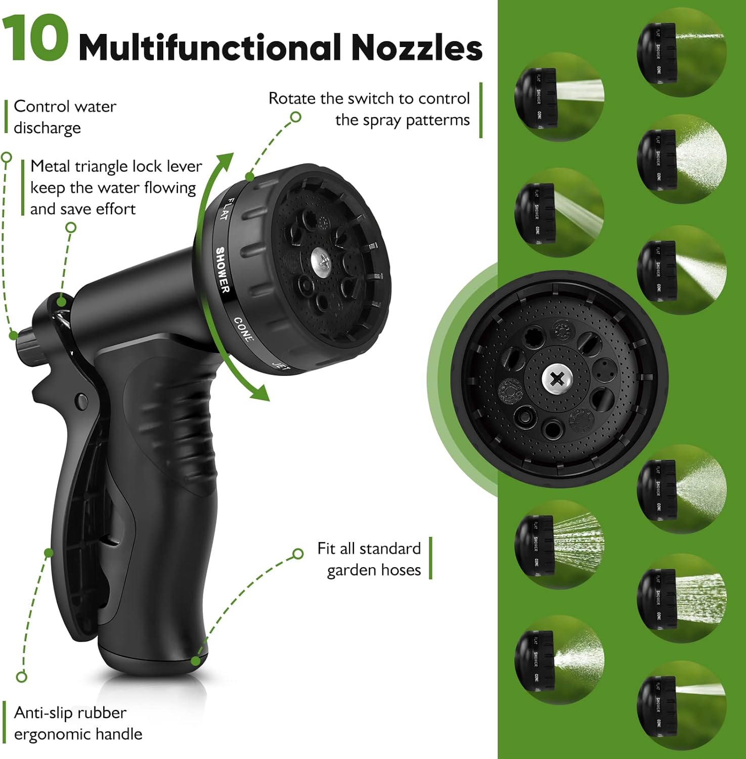 - The water hose metal nozzle is made of metal zinc alloy and ABS plastic for greater durability and corrosion resistance. The thumb control makes this nozzle easy to hold and switch. In addition, the ergonomically designed nozzle grip features a non-slip rubber pad that is more comfortable to use and prevents slippage. The rotating baffle allows you to choose from 10 spray patterns to meet all your needs. Can be used for watering gardens and cleaning houses, cars, yards, pet bathrooms, and so on.