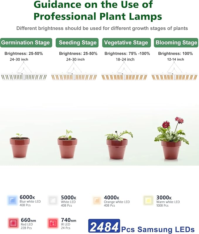 • Dimmer & Timer Functions: Our grow lights consist of 660nm Red light, IR 740nm, and 6000K, 5000K, 4000K, 3000K white light spectrum. The panel dimmers can adjust the intensity of the light, and the growing lamps support timer setting and time reservation function. This helps plants grow healthier. Perfect for 5x5 ft, with max coverage of 6x6 ft.
