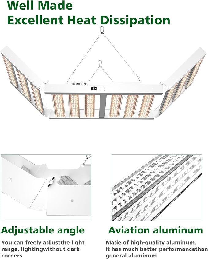 • Professional 3-Stage Full Spectrum: Sonlipo plant light is designed with 3 types of Sunlike full spectrum to meet the different growth stages of plants, including Seeding, Vegetative, and Flowering & Fruiting stages. This increases plant yield to a maximum of 2.9 g/w. The 3 full spectrum modes are controlled by a panel (VEG, V&B, BLOOM), suitable for all plants and all stages of plant growth..