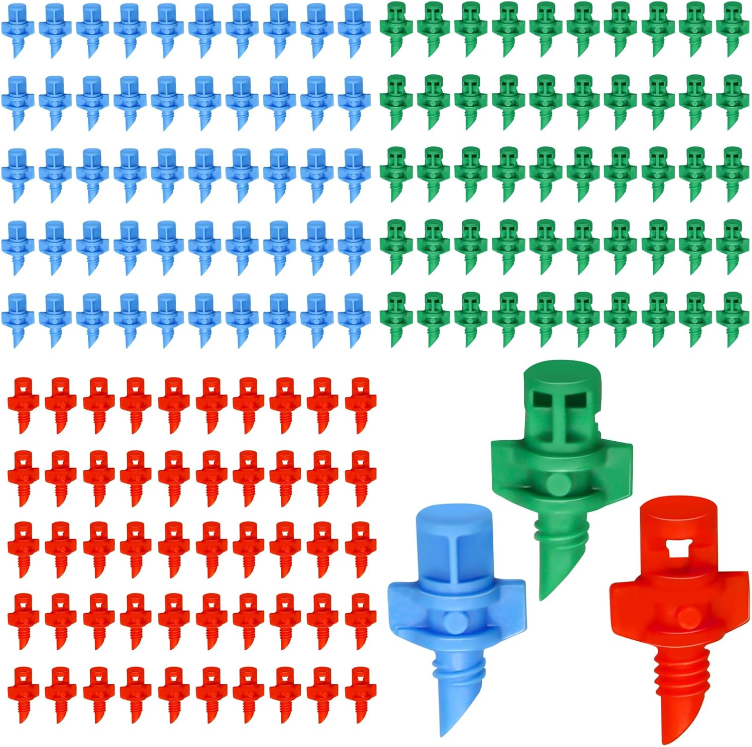 • 【What You Will Get】 The package contains 50 blue 90° misting sprinklers, 50 green 180° misting sprinklers, and 50 red 360° misting sprinklers. The size of the sprayer is 21x12 mm/ 0.82 x 0.47 inches, a total of 150 drip system sprinkler heads. Sufficient for your daily use and replacement. If you are Unsatisfied with the product you received, please tell us, and we will solve the problem for you as soon as possible.