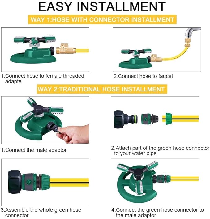 • [IMPORTANT NOTICE]:The garden sprinkler needs 21.34PSI for spin at least & the Spray Distance depends on the nozzles mode & water pressure.Please don't screw the spray head into the base TOO TIGHT.Each nozzle arm needs to be switched and locked into position and hear a CLICK sound which means it is in the right place.More detailed information about Yard sprinklers is contained in the Instruction Book