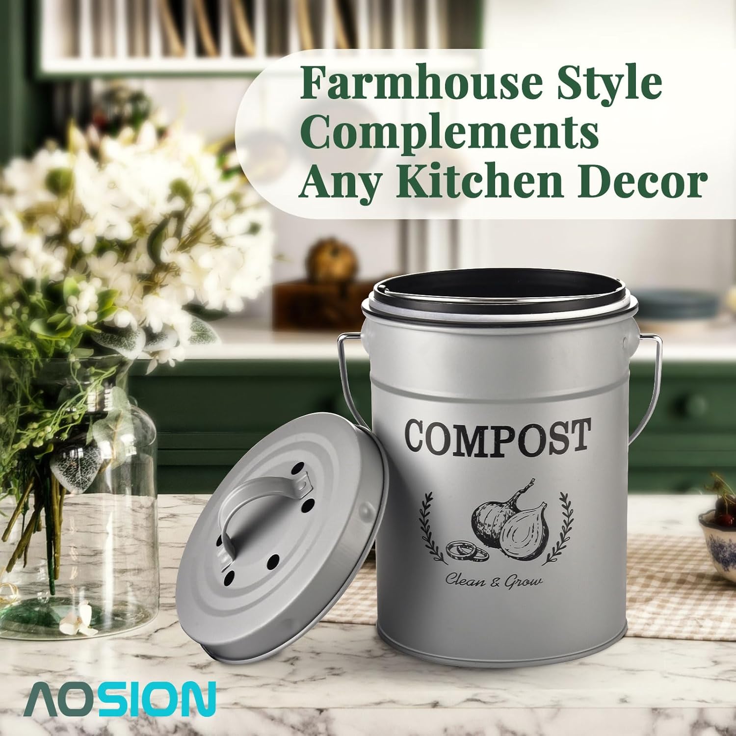 AOSION Countertop Compost Bin Kitchen,Odor Resistant Indoor Compost Bin with Lid and Compost Bags,Compost Bucket Composter Container for Food Waste,Grey